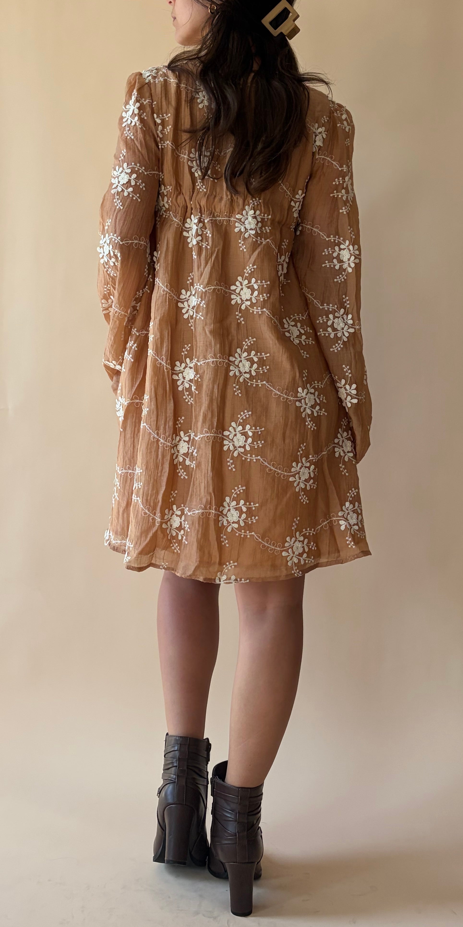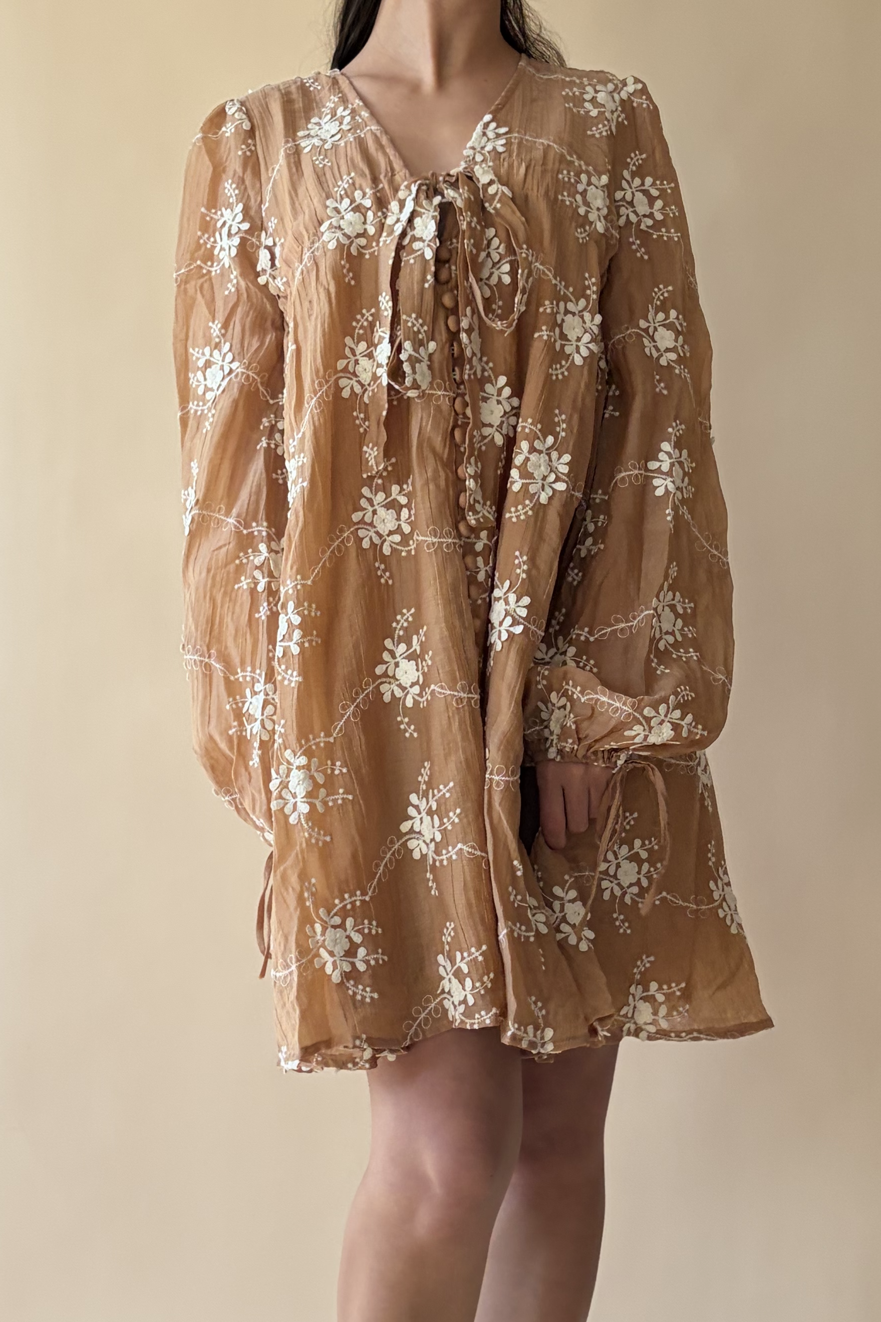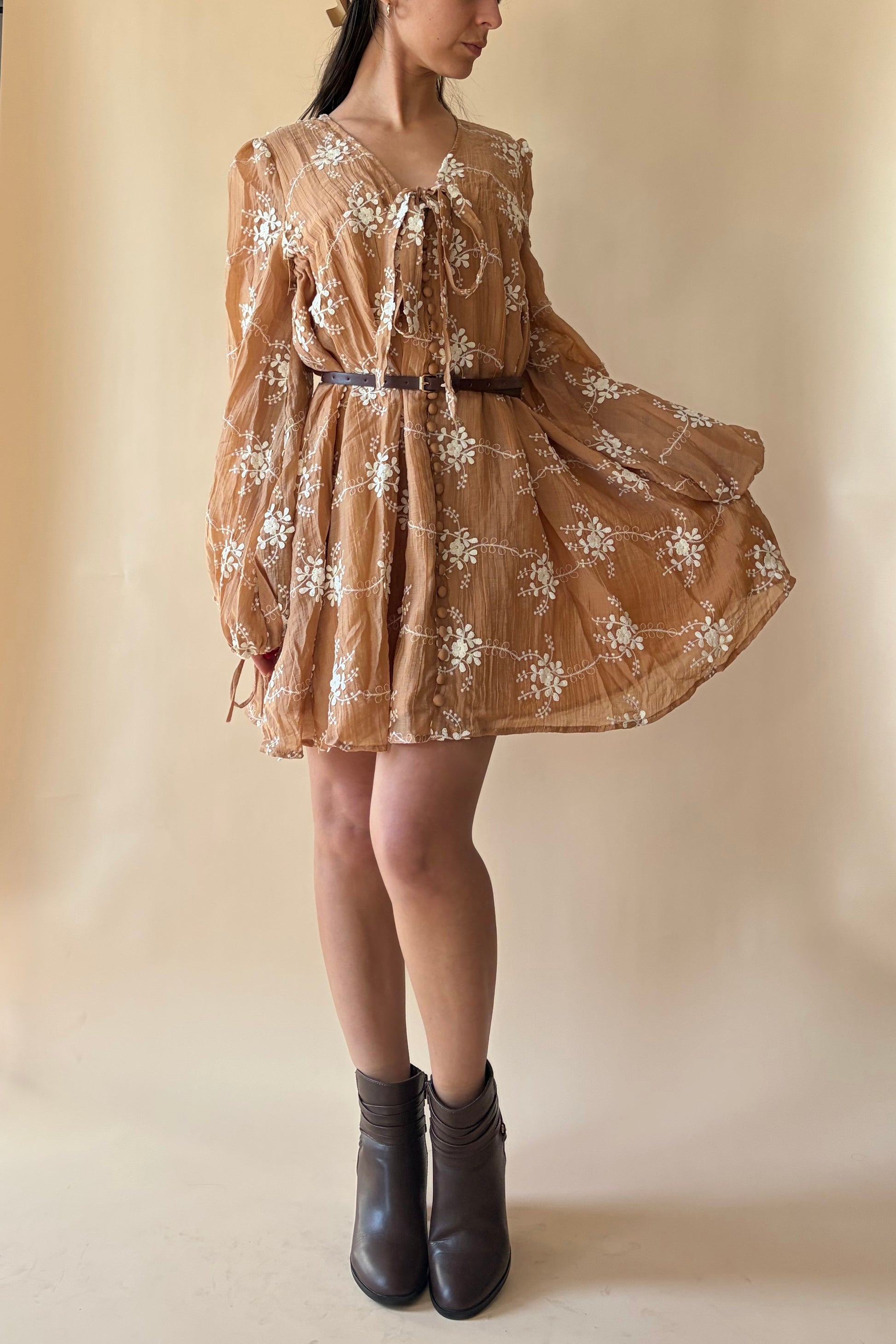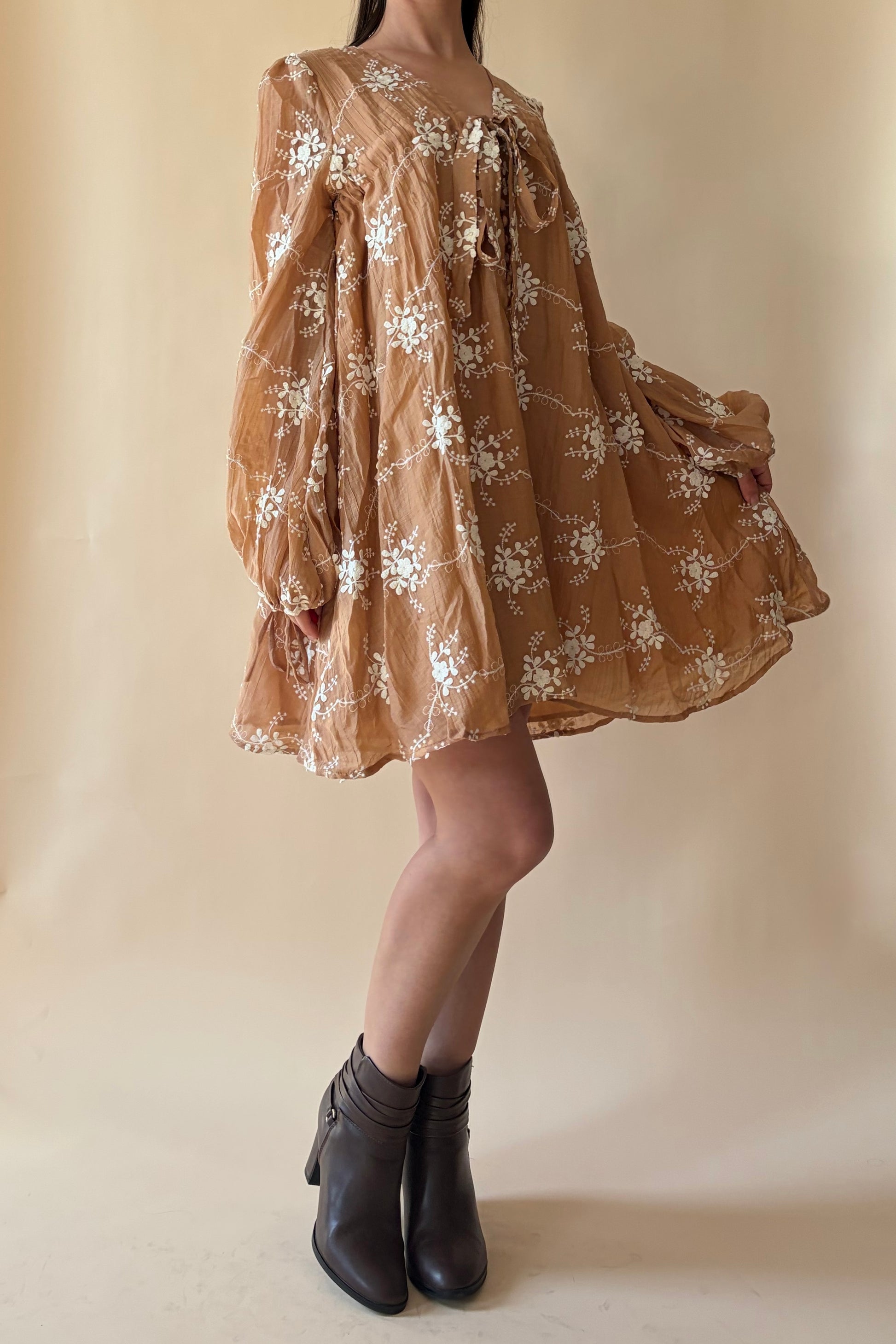 Soft, mocha babydoll dress featuring delicate floral embroidery. Designed with a flattering empire waist, long sleeves with tie cuffs, and a graceful A-line silhouette.