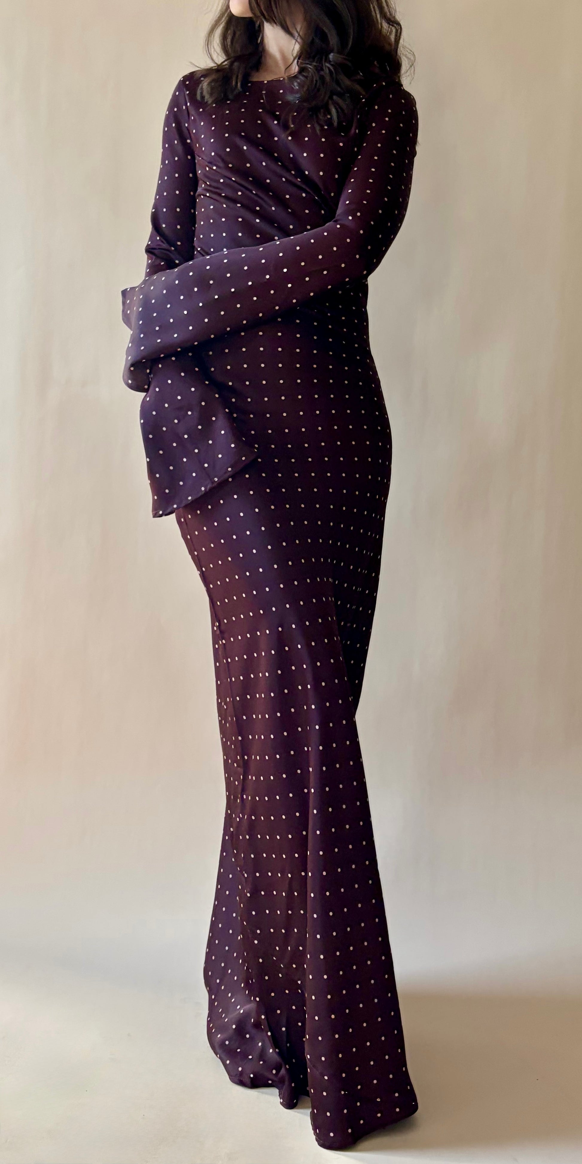 Long and sleek dark brown satin dress with tiny light pink polka dots. Pull on design. No zipper.