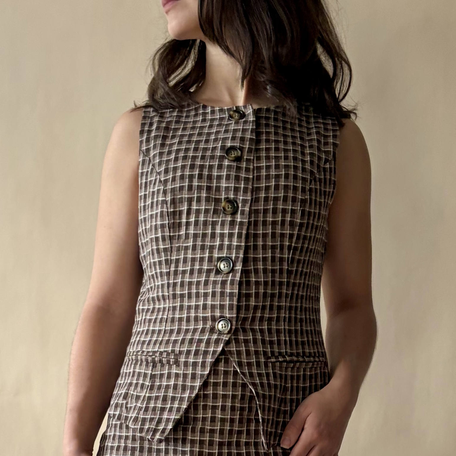 Brown and cream plaid button up top. Pair with the Hazel mini skirt for a matching head to toe look.